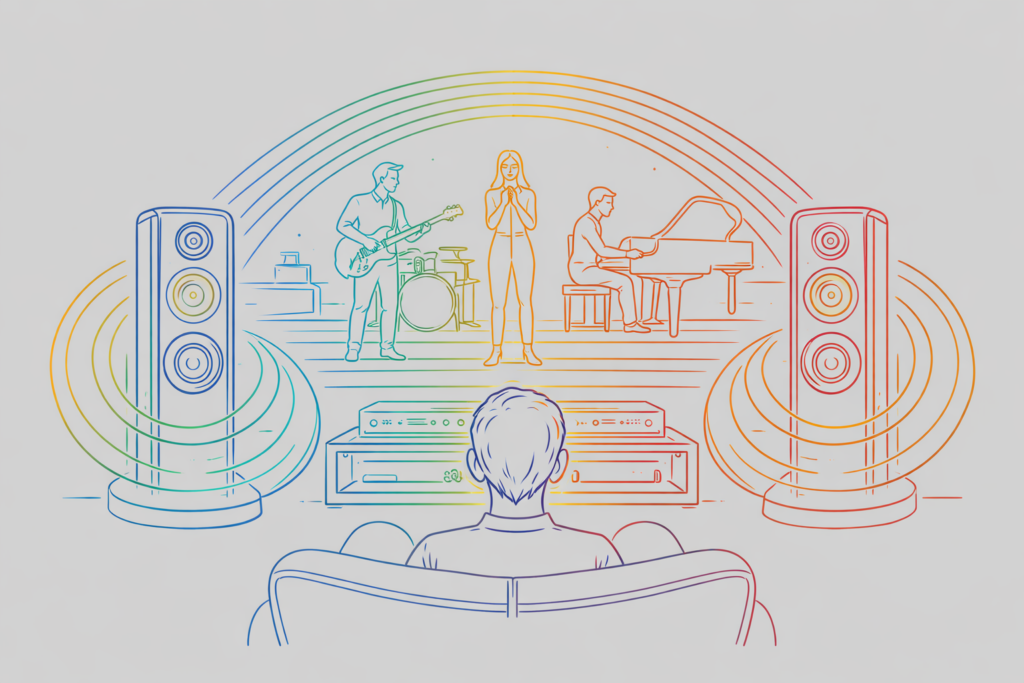 เมื่อระบบเสียงมี imaging ที่ดี สิ่งแรกที่ผู้ฟังมักสังเกตได้คือเสียงแต่ละชิ้นมีตำแหน่งที่ชัดเจนในอากาศ เสียงร้องจะอยู่ตรงกลางอย่างมั่นคง กีตาร์อาจอยู่ด้านซ้ายเล็กน้อย และเปียโนอาจกระจายอยู่ทางขวา ทุกอย่างดูเหมือนถูกจัดวางอยู่บนเวทีจริงมากกว่าการลอยออกมาจากกล่องลำโพง ความรู้สึกอีกอย่างคือ “focus” ของเสียง หาก imaging ดี เสียงร้องจะไม่ฟุ้งหรือเบลอ แต่จะมีขอบเขตชัดเจนเหมือนมีแสง spotlight ส่องอยู่ ผู้ฟังสามารถชี้ตำแหน่งเสียงในอากาศได้แทบจะทันที ความรู้สึกนี้ทำให้การฟังดนตรีมีมิติและน่าติดตามมากขึ้น